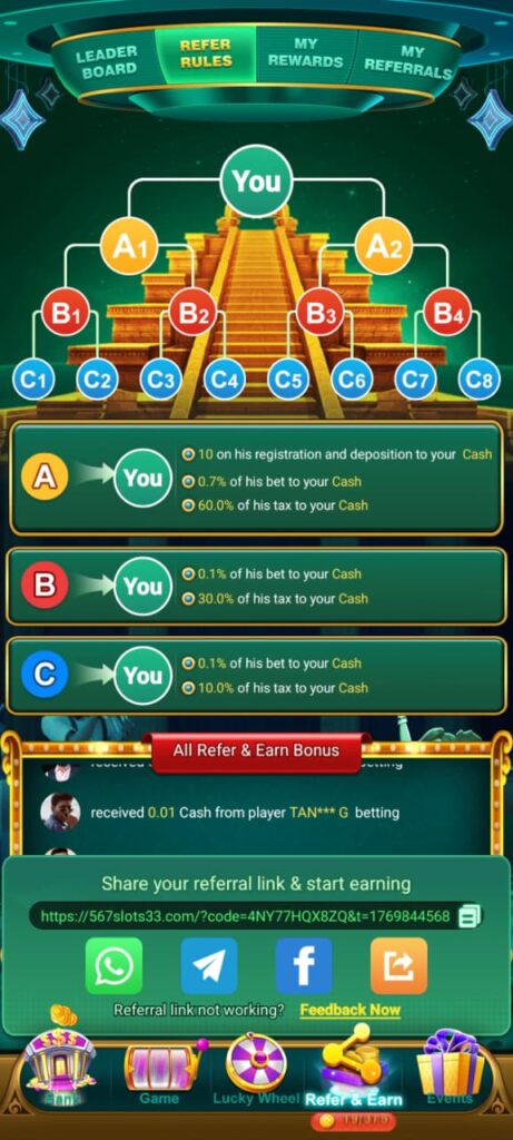 567Slots गेम के अंदर refer करने ले लिए आपको गेम की Lift Side पर निचे की तरफ Corner पर Refer & Earn बटन पर Click करे।
